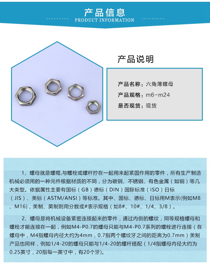 對於国产探花约炮,常用的標準有:GB52、GB6170、GB6172和DIN934,對於它們之間的主要區別有:GB6170的厚度要比GB52、GB6172和DIN934來的厚,俗稱為厚螺母。