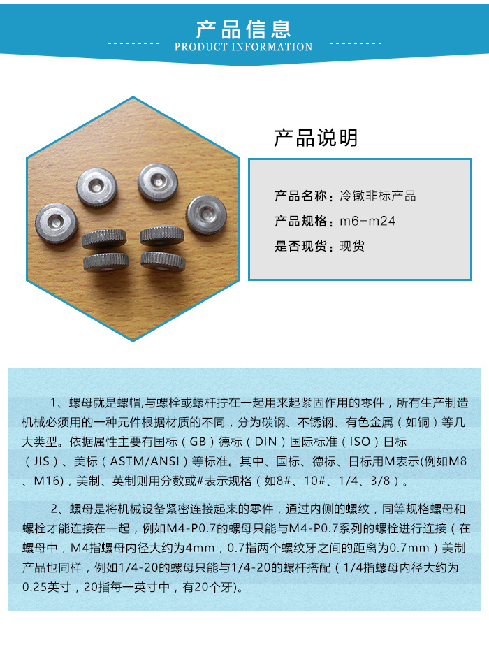 管用圖形圓螺母就是螺帽,與螺栓或螺杆擰在一起用來起緊固作用的零件,所有生產製造機械必須用的一種原件.螺母的種類繁多,91探花视频在线观看常見的有國標,英標,美標,日標的螺母.螺母根據材質的不同,分為碳鋼、高強度、不鏽鋼、塑鋼等幾大類型.根據產品屬性對應國家不同的標準號分為普通、非標、(老)國標、新國標、美製、英製、德標。大小不同,螺紋不等分為不同的規格. 一般國標、德標用M表示(例如M8、M16),美製、英製則用分數或#表示規格(如8#、10#、1/4、3/8)