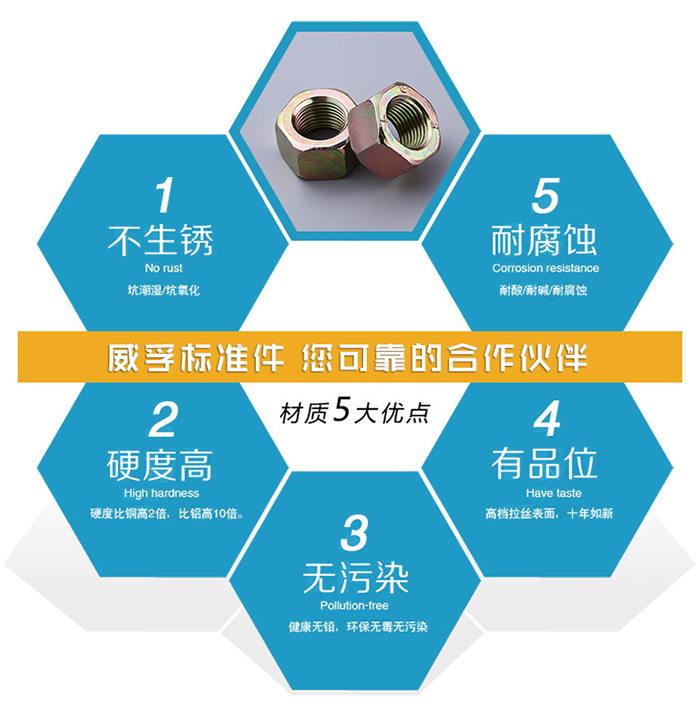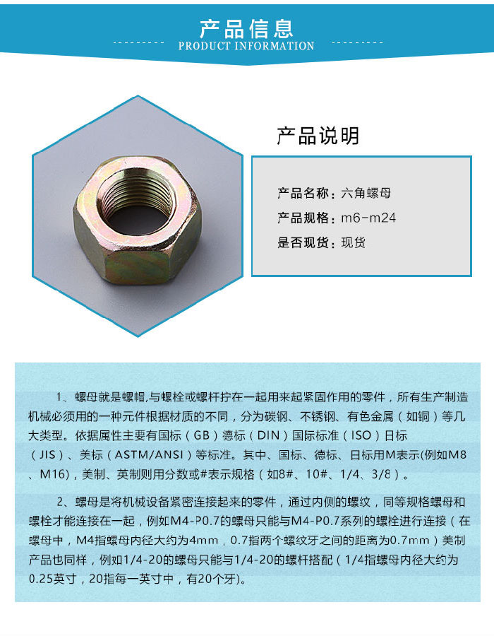 1、螺母就是螺帽,與螺栓或螺杆擰在一起用來起緊固作用的零件,所有生產製造機械必須用的一種元件根據材質的不同,分為碳鋼、不鏽鋼、有色金屬(如銅)等幾大類型。依據屬性主要有國標( GB )德標( DIN )標準( ISO )日標(JIS)、美標( ASTM/ANSI)等標準。其中、國標、德標、日標用M表示(例如M8、M16),美製、英製則用分數或#表示規格(如8#、10#、 1/4、3/8 )。