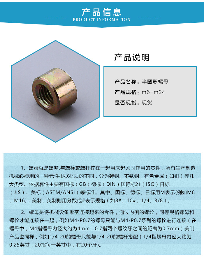 半圓形螺母的工作原理是采用螺母和螺栓之間的摩擦力進行自鎖的。但是在動載荷中這種自鎖的可靠性就會降低。在一些重要的場合91探花视频在线观看就會采取一些防鬆措施,保證半圓形螺母鎖緊的可靠性。鎖緊螺母就是其中的一種防鬆措施。