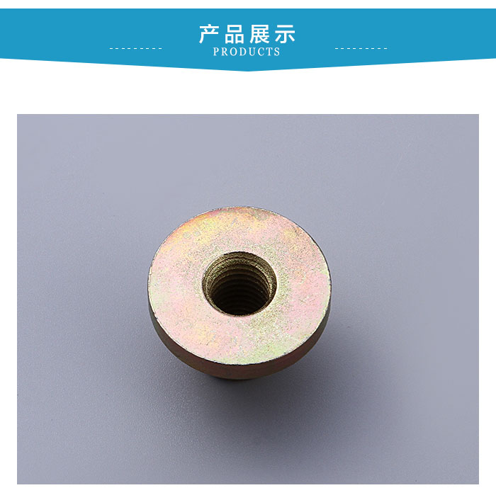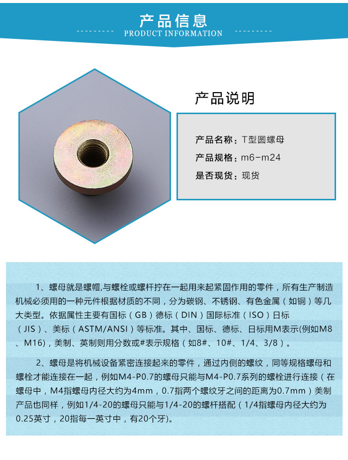 T型圓螺母包括一結構主體,該結構主體為一圓環,於產品的圓環內圈設置多組螺紋,產品的圓環包括組合連接的圓帽及支柱,產品的螺紋為倒梯形的右旋螺紋。通過內圈梯形凹槽組成螺紋,無需緊固件配合便能實現擰緊固定,結構簡單,便於大規模推廣使用,且成本低,節約資源,滿足不同領域及特殊場景的使用。