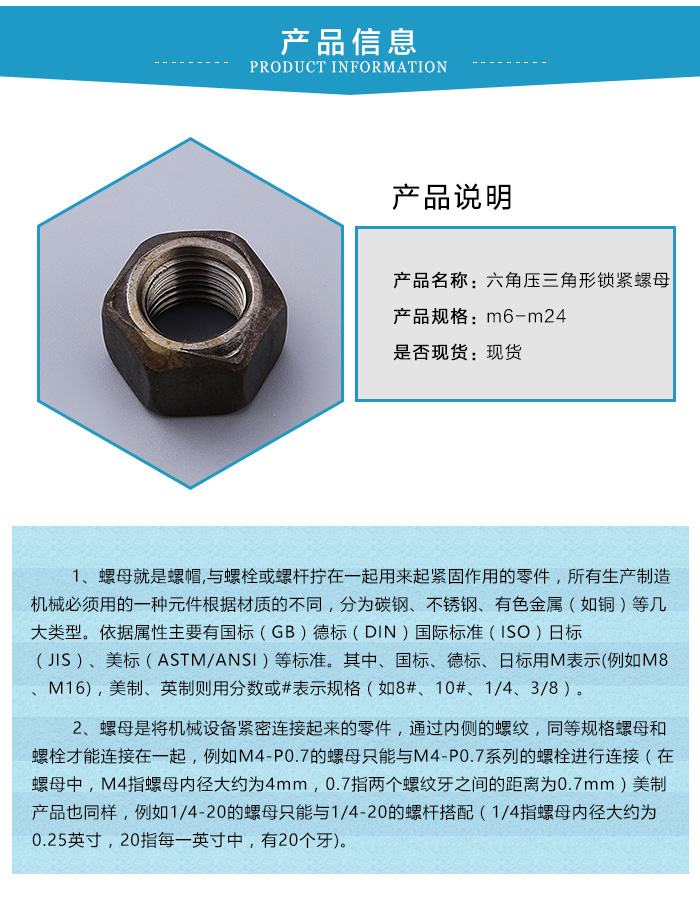 六角壓三角形鎖緊螺母主要用於鎖緊通絲外接頭或其他管件時,六角壓三角形鎖緊螺母的防鬆效果優劣主要取決於螺母與螺栓齧合螺紋之間相互作用力。提高齧合螺紋之間相互作用力的方式有很多種,比如施必牢螺母的螺紋結構改良,尼龍螺母的尼龍增糙,螺紋的表麵處理等。