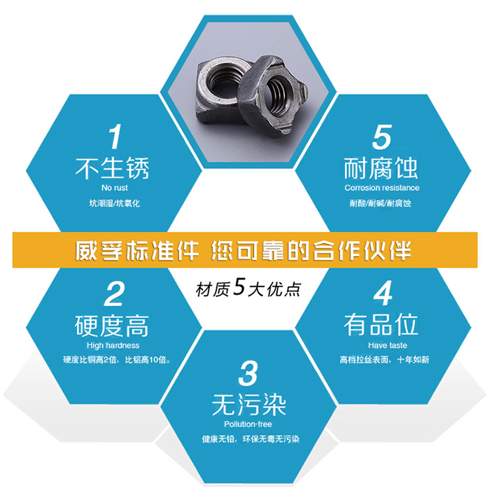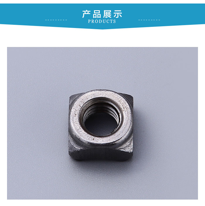 四角焊接螺母屬於焊接螺母中的一種,使用範圍廣,,強度比較大,且薄厚都可以,但是由於高溫會導致被連接件變形,且不可拆卸,而且一些活潑金屬不能用通常方法焊接,比如鋁,鎂等,需要保護氣或氬弧焊,要求加工工藝和精度。