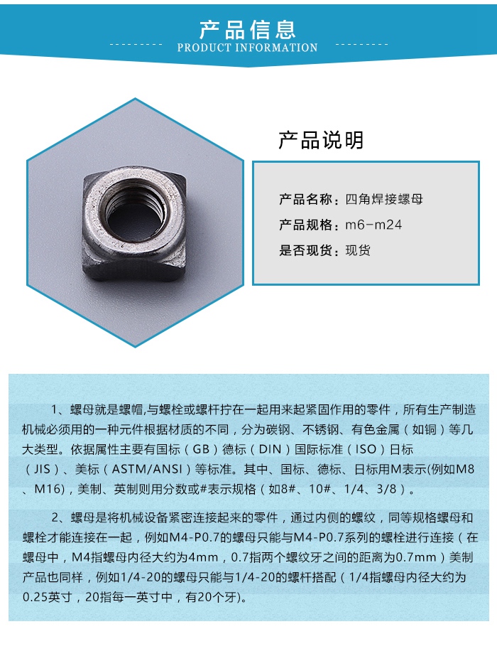 四角焊接螺母是一種在螺母外適合焊接的螺母,一般是可焊接的材料製成的而且較厚適與焊接,焊接是相當於把兩個分離件變成一個整體,用高溫將金屬融化後混合到一起再冷卻,中間會加入合金,內部是分子力的作用,強度一般比母體強度大[1] 。焊接參數的實驗要看焊縫的熔合大小,根據熔合大小調節焊接參數,直到消除缺陷。當然焊接質量的好壞與焊前處理有關,清灰、油漬等。