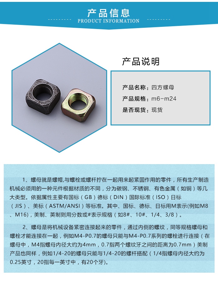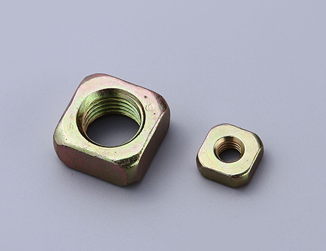 方形螺母表麵處理采用:電鍍白鋅,藍白鋅,五彩鋅,發黑,本色五種表麵處理方式可選。